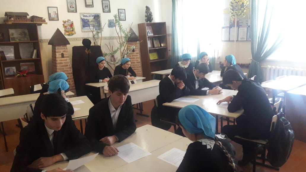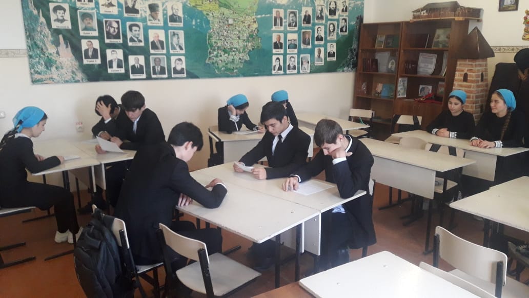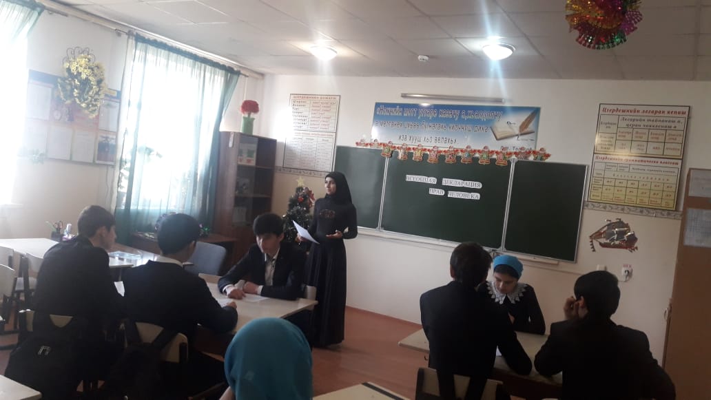 В 10 классе проведён единый урок обществознания, посвящённый ко дню конституции РФ на тему: «Всеобщая декларация прав человека». На едином уроке старшеклассникам рассказали об истории создания Всеобщей декларации прав человека, о содержании Всеобщей декларации прав человека и, о значении Всеобщей декларации прав человека. Урок получился оживлённым и поучительным. После учитель разделил учащихся на несколько групп для актуализации знаний в форме фронтального опроса и работы по карточкам. В начальном звене были проведены классные часы, в ходе которых учащиеся знакомились с государственными символами Российской Федерации. Так же, ко дню конституции Российской Федерации в фойе школы была организована выставка рисунков.
