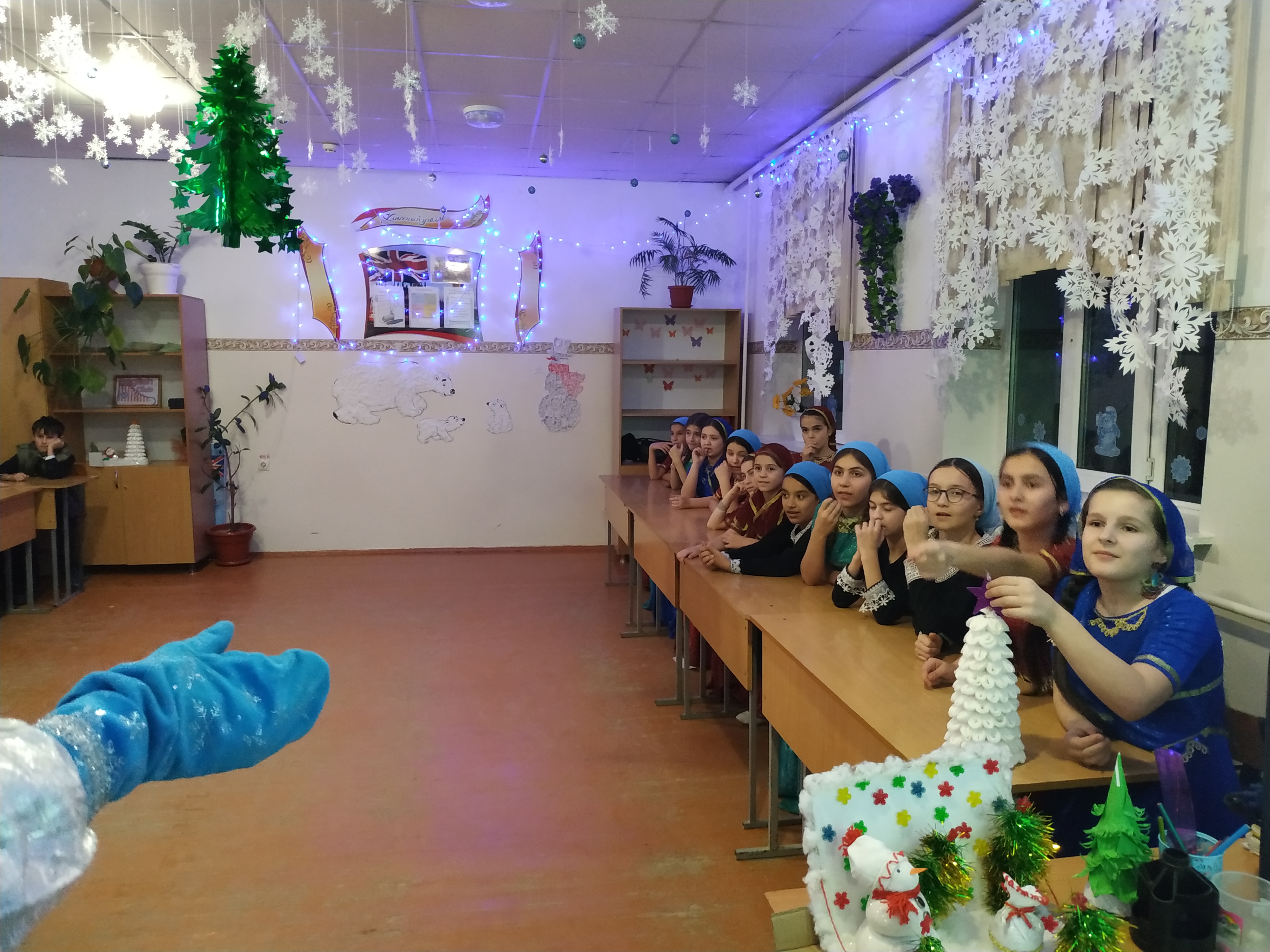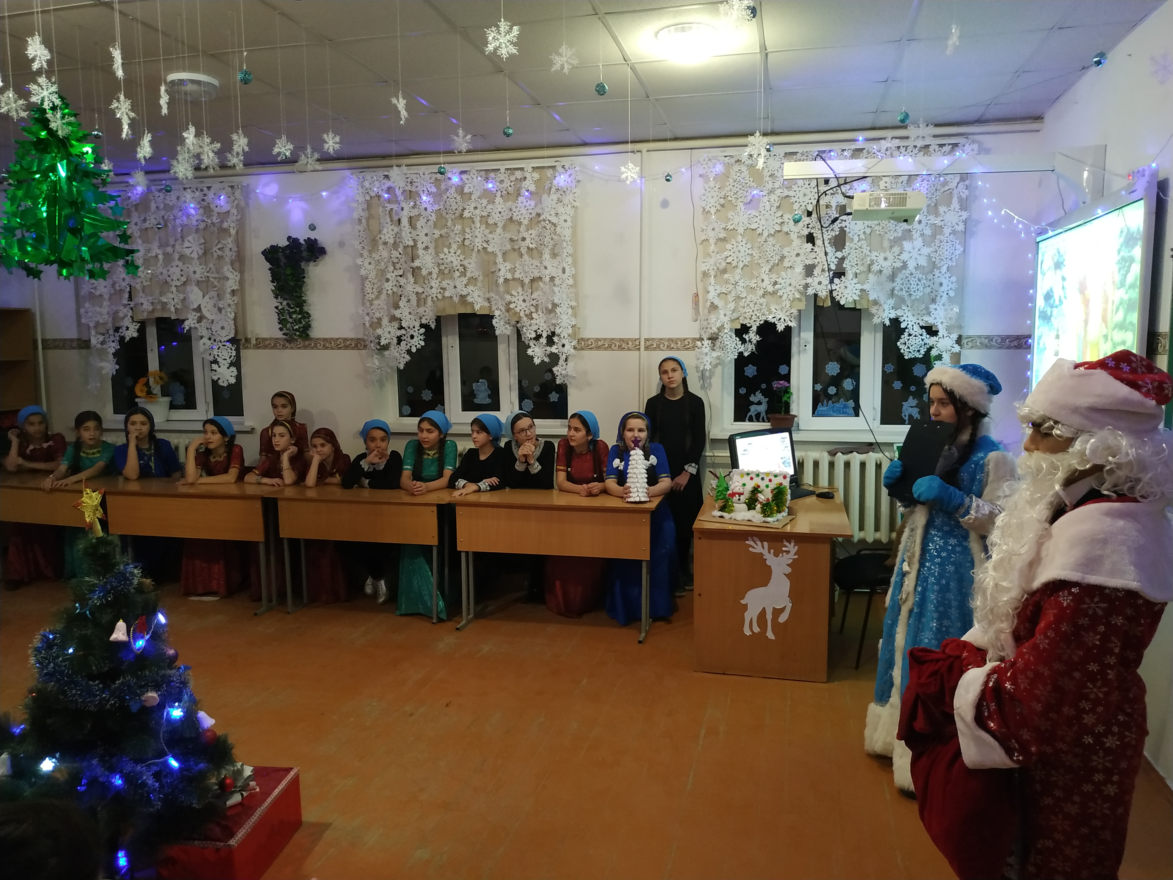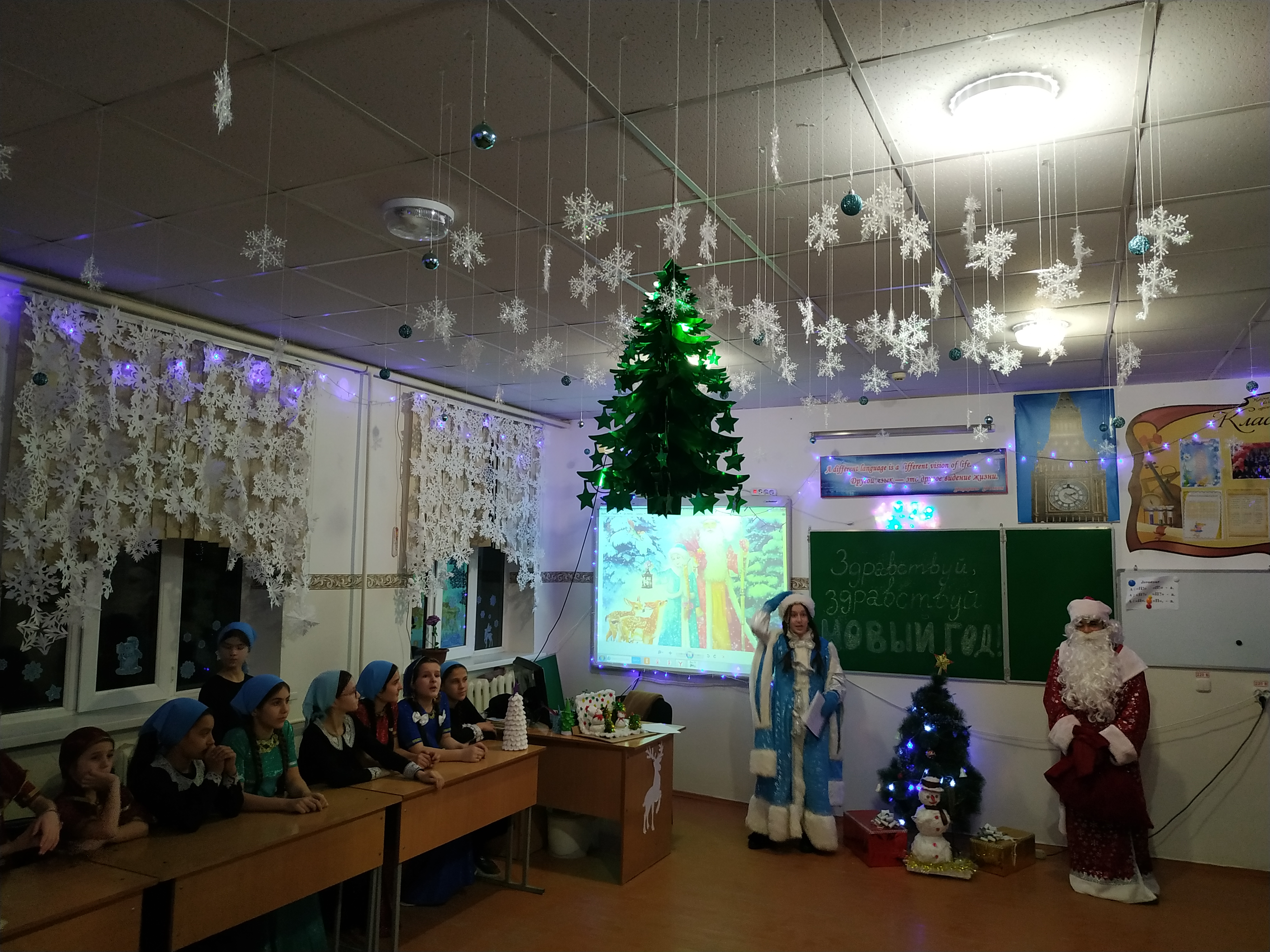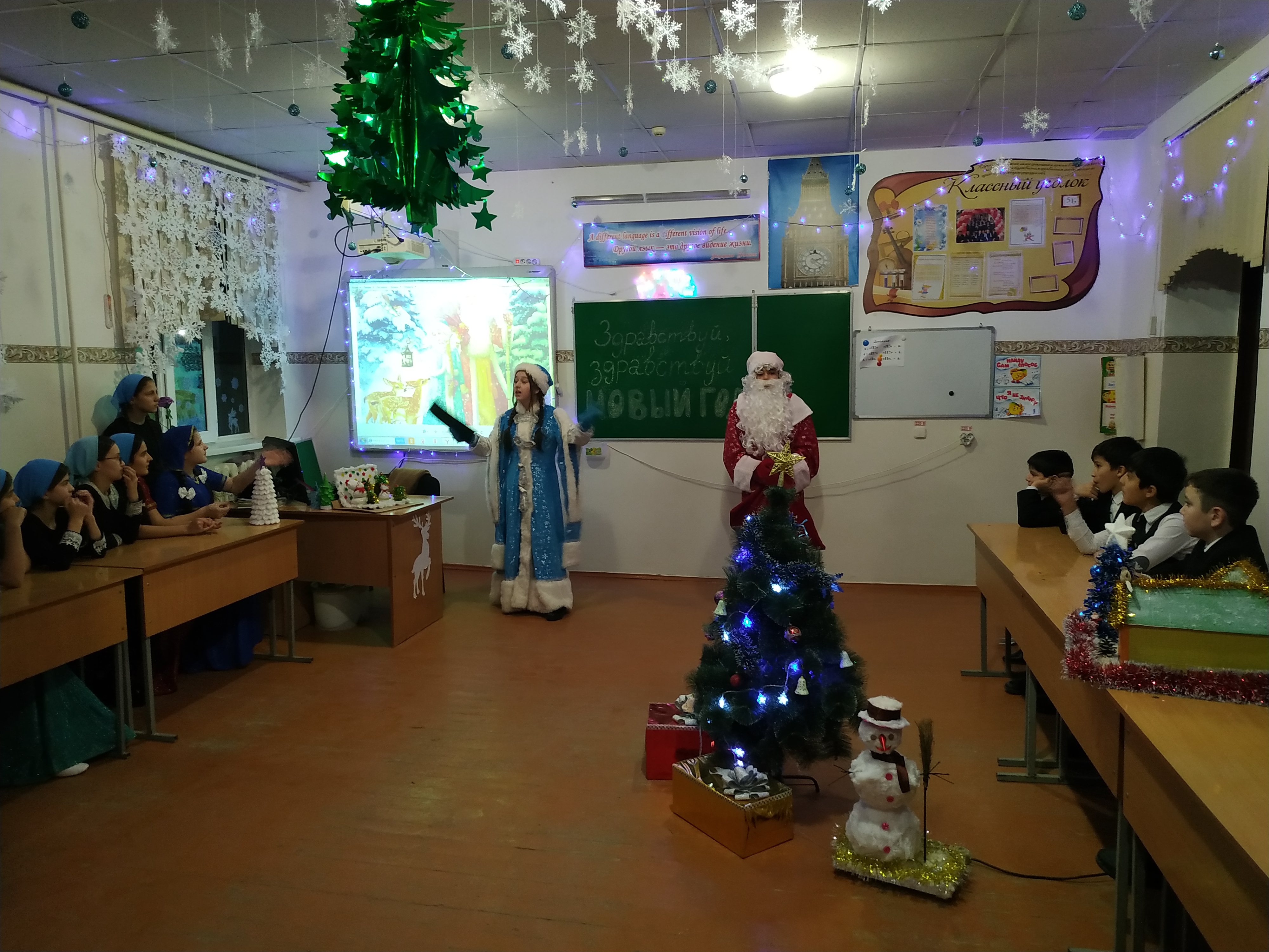 Учащиеся 5 «б» класса подготовились к мероприятию очень ответственно. Свой кабинет они превратили в новогоднюю сказку. В эту сказку они пригласили Деда Мороза, Снегурочку и учащихся параллельных классов. Снегурочка устроила для детей викторину разделив их на две команды: команда мальчиков – «Снеговики» и команда девочек – «Снежинки». На вопросы команды отвечали большим рвением к победе, также рассказывали стихи и пели песни про Новый год! Но в итоге победила команда «Снежинки».