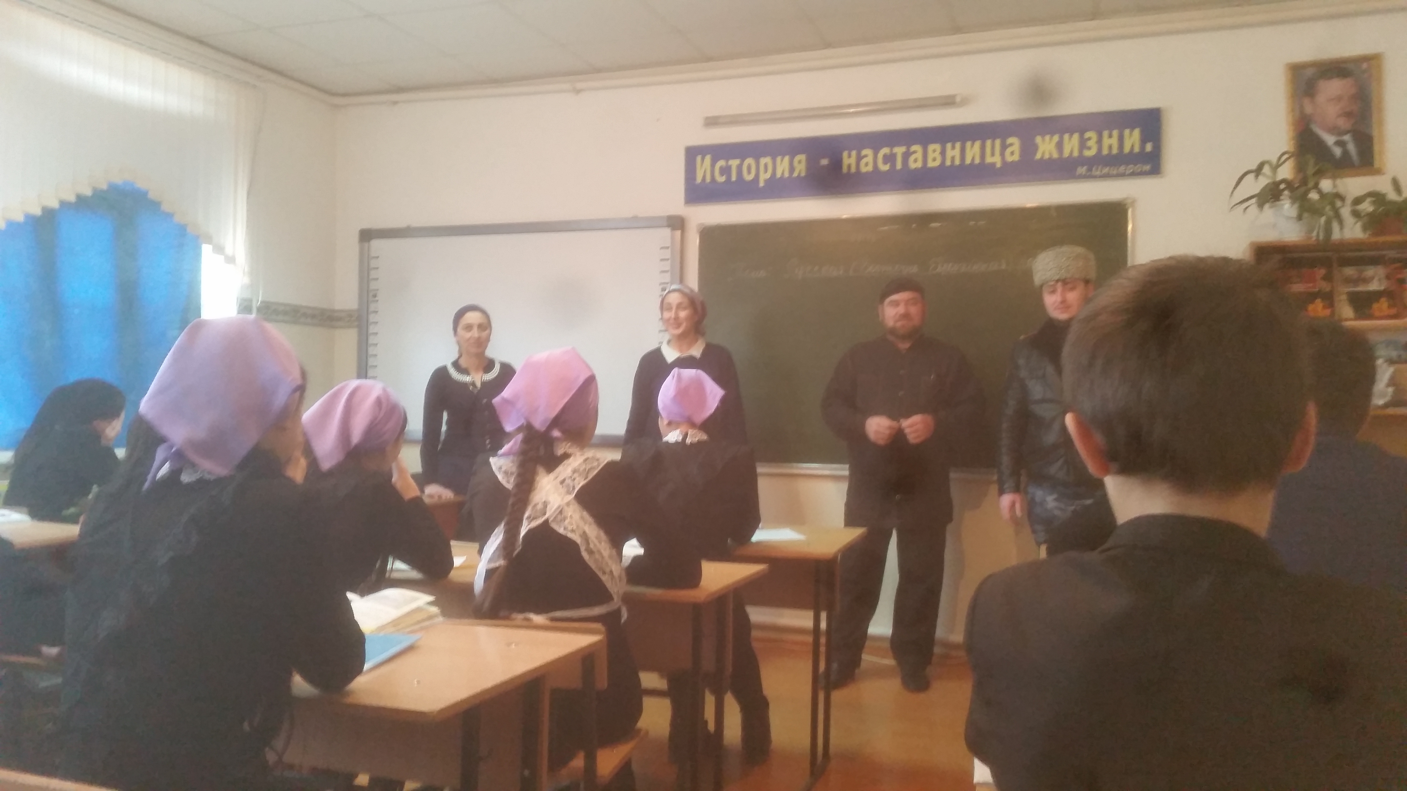 2015год, октябрь. Совместная встреча администрации МБОУ «Шуанинская СШ» заместителя директора по ВР Юсуповой Н.Д.,педагога –организатора по ДНВ и Р Нажаева Ш.Ш. ,социального –педагога Курбановой З.Р. , инспектора по делам несовершенолетних Мартанукаева З.М. с учащимися 9-11 классов на тему: «Преступления и его последствия» с целью профилактики правонарушений несовершенолиетних.