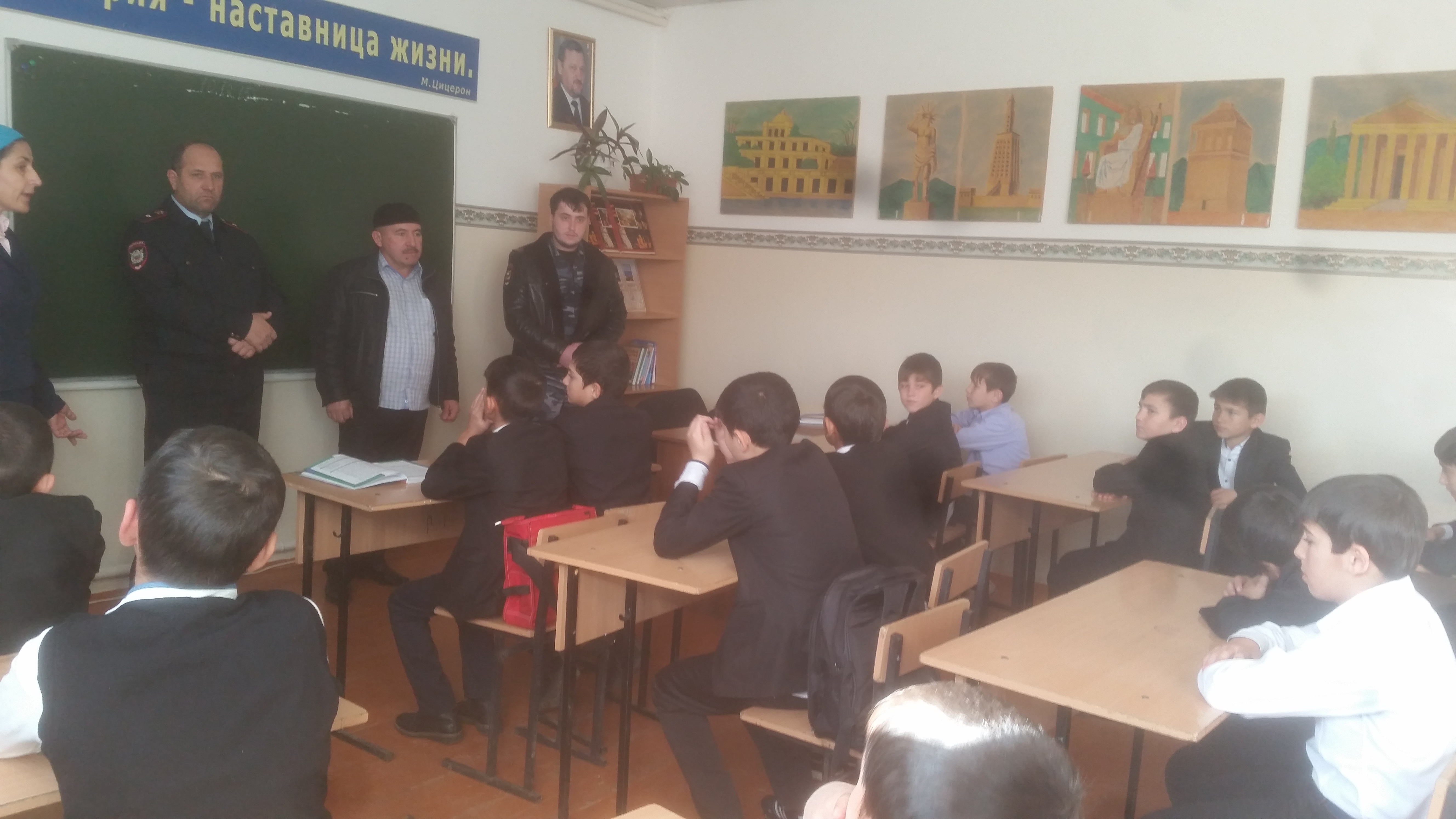 2015год, декабрь. Совместная встреча администрации МБОУ «Шуанинская СШ», главы С.Шуани Сатабаева Р.У.участкового инспектора-Алимханова С.М, инспектора по делам несовершенолетних Мартанукаева З.М. с учащимися 5-7 классов на тему: «Как научиться быть ответственными за свои поступки » с целью профилактики правонарушений несовершенолиетних.