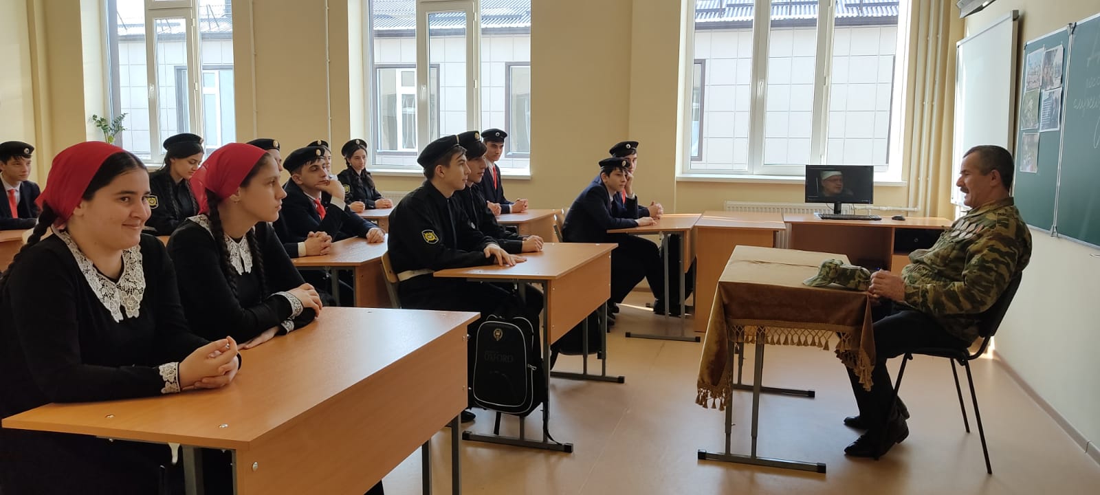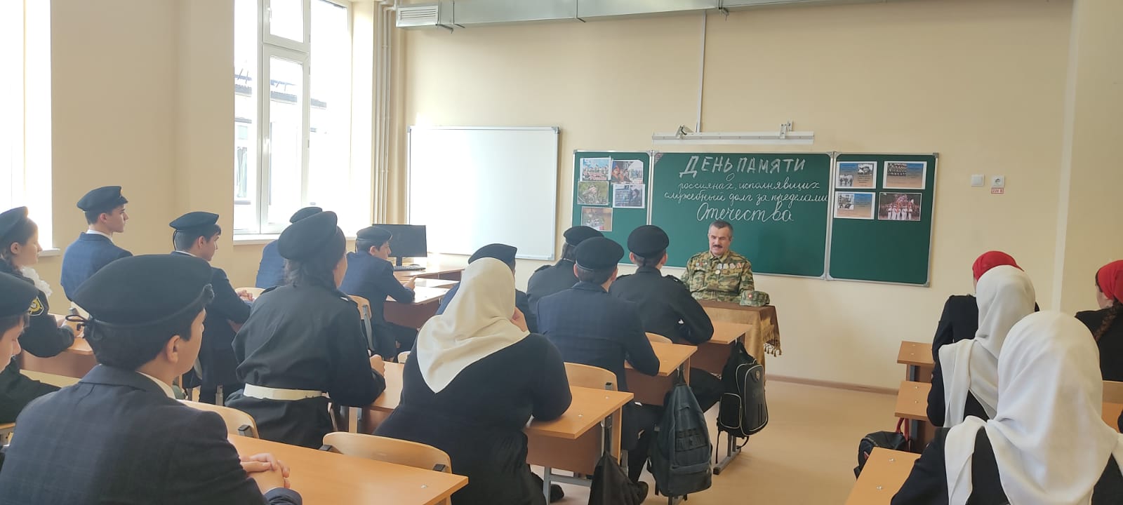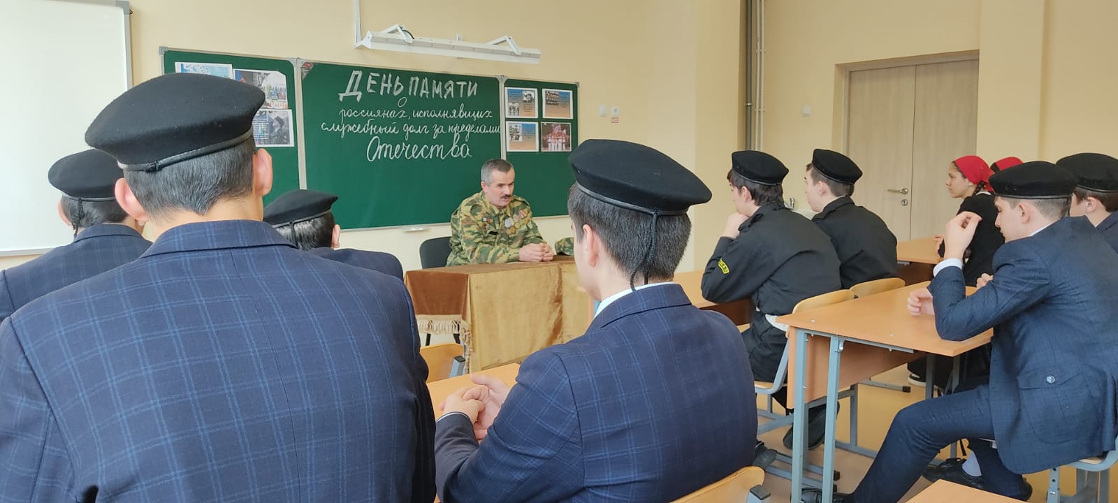 «Мы в большом долгу перед теми, кто с достоинством и честью, порой ценою своей жизни выполнял приказ Родины за ее пределами. Наши соотечественники самоотверженно решали интернациональные задачи в Афганистане, проявили мужество во время агрессии Грузии против Южной Осетии, в других «горячих точках»,-классный руководитель. С большим интересом все присутствующие посмотрели фильм «Хроника афганской войны», продемонстрированный Юными кадыровцами. После страшных кадров и волнующих цифр, ученики с охотой слушали воина-афганца и задавали интересующие их вопросы. Интересовало ребят все: как мирные афганцы относились к воинам, знали ли близкие о том, где находились,…? В своем выступлении гость рассказал о себе, о своем жизненном пути, о том, как он оказался участником военных действий, как не раз попадал под обстрелы, самому приходилось не расставаться с автоматом ни днем, ни ночью. Но и сегодня, беседуя с мальчишками – будущими призывниками, он стремится убедить их в главном: «Служить должен каждый мужчина. Армия учит понимать слово «надо».