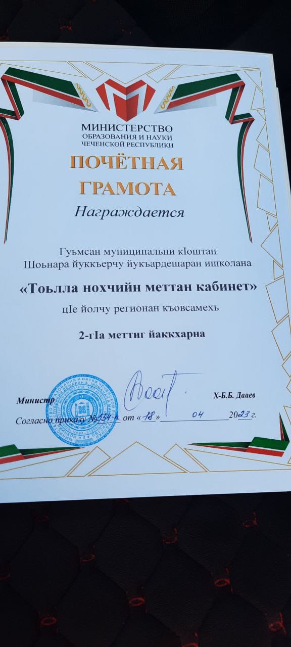 13.05.2023В Чеченской Республике успешно завершился региональный конкурс «Лучший кабинет чеченского языка», проведённый в рамках реализации мероприятий, приуроченных к Году чеченского языка. Конкурс был направлен на определение лучшего кабинета чеченского языка среди школ республики, а также на поощрение и повышение качества преподавания и воспитания уважения к языку и духовным ценностям народа. Лучшим в Гудермесском районе признали кабинет чеченского языка МБОУ "Шуанинская СШ" заведующей которого является Магамедова Элита Аладиевна.В Чеченской Республике кабинет чеченского языка в МБОУ "Шуанинская СШ" заняла 2-ое место.