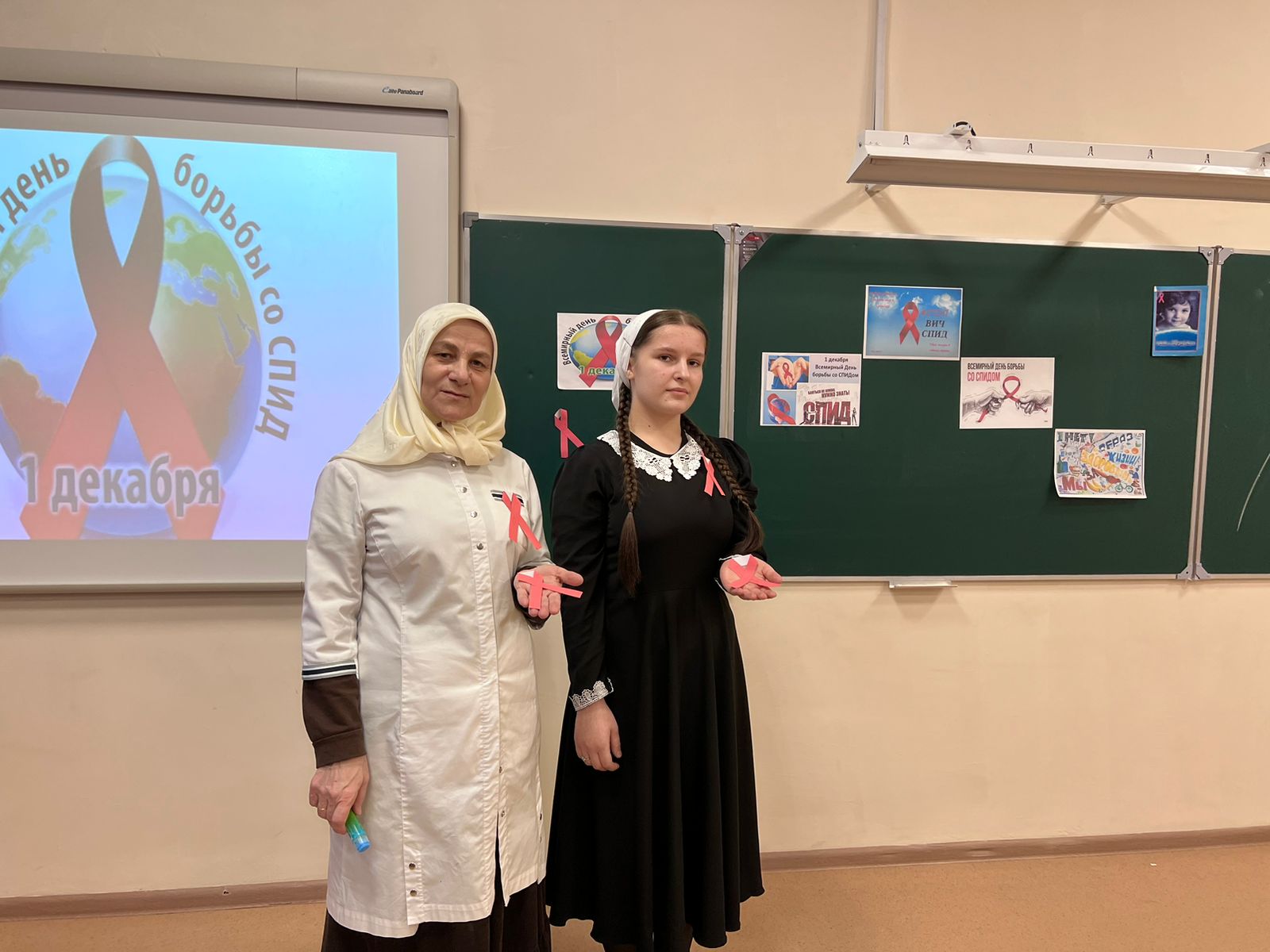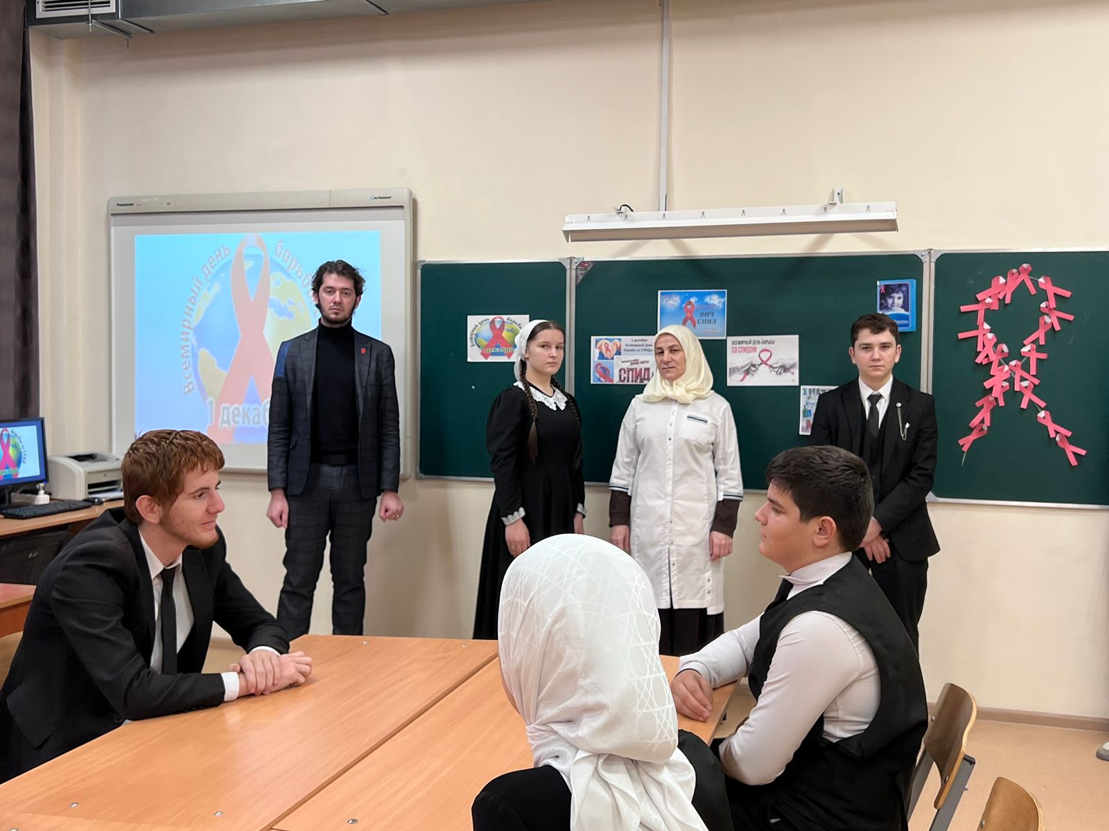 В акции могли принять участие ученики школы, педагоги, медработник школы, Алисултанова С.З, активисты детских объединений, волонтеры.,….и другие заинтересованные лица показывая, что красная ленточка-это символ солидарности с теми, кого эта проблема затронула лично, символ памяти о тысячах унесённых этой жестокой болезнью, это символ надежды, что вскоре будет найдено лекарство, излечивающее от СПИДа..
