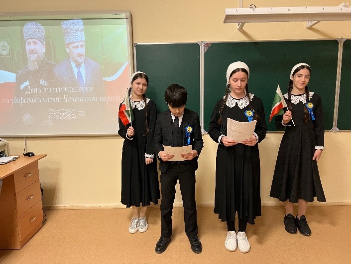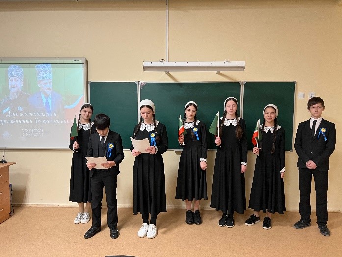 На классном часе были представлены различные материалы о восстановлении независимости Чечни, напомним, 9 января 1957 года Президиум Верховного Совета РСФСР издал Указ «О восстановлении Чечено-Ингушской АССР в составе РСФСР и упразднении Грозненской области». Документ предусматривал снятие запрета на возвращение чеченцев и ингушей, подвергшихся тотальной депортации в 1944 году в Казахстан и Среднюю Азию, в места постоянного проживания. Именно с этой даты началось массовое переселение чеченцев и ингушей на родные земли.