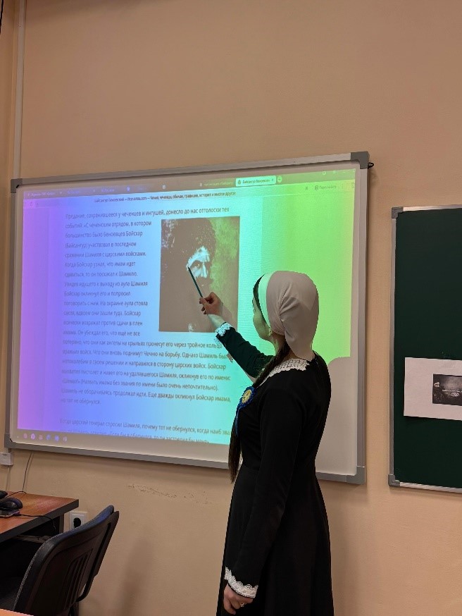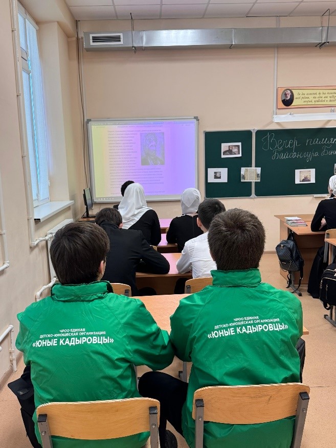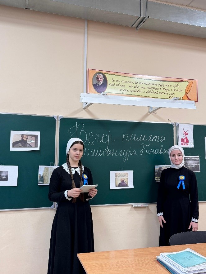 Учащиеся подготовили небольшую программу: прозвучали стихи о Байсангуре Беноевском, были показаны тематические слайды с историческими фотографиями. Учитель чеченской литературы рассказал о роли Байсангура в истории чеченского народа.