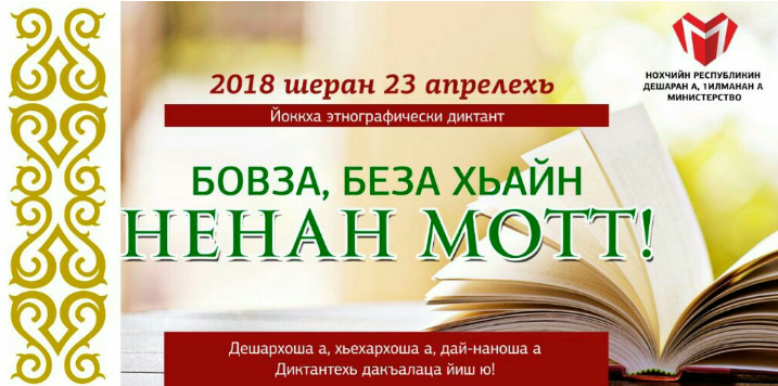 12.04.20182018 шеран 23 апрелехь Нохчийн Республикин дешаран а, Iилманан а Министерствос дIахьур ю нохчийн меттан Денна лерина Йоккха этнографически диктант "Бовза, беза хьайн ненан мотт!" Диктант дIаяхьа аьтто кхоллар тIехь ду (тIедиллина) Нохчийн Республикин массо а дешаран организацешна."Бовза, беза хьайн ненан мотт!" Диктант дIаяхьаран Iалашо ю нохчийн матте блок безам кхиор а, цуьнан вайн дахарехь лелар совдаккхар а, Нохчийн Республикин бахархойн ненан маттах долу хаарш алсамдахар а.Диктантехь дакъалаца таро хир ю дешархойн, церан дай-нанойн, хьехархойн. Иштта Диктант язъян йиш ю лууш волчу муьлхачун а, и дIахьочу дийнахь цхьана пунктехь регистраци йичахьана.