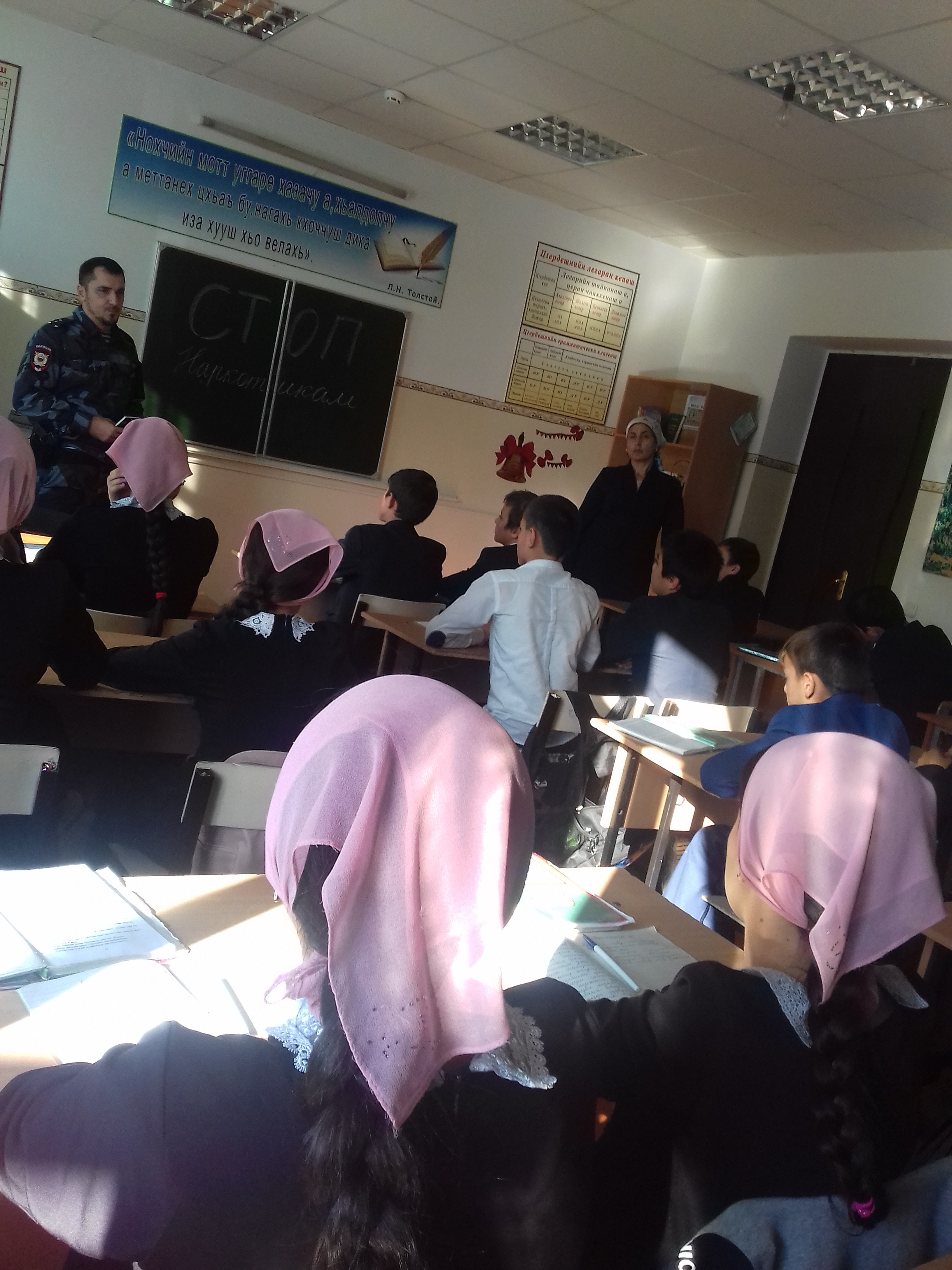 03.10.2018В МБОУ «Шуанинская СШ» 3.10.2018 г. состоялась встреча инспектора ПДН ОМВД России по Гудермесскому району Чеченской Республики, капитана полиции Арсалиева Майрбека Денисолтаевича совместно с администрацией школы Юсуповой Н.Д., по профилактике правонарушений несовершенолетних со школьниками 8-11 классов на тему : «Преступность и подросток»
